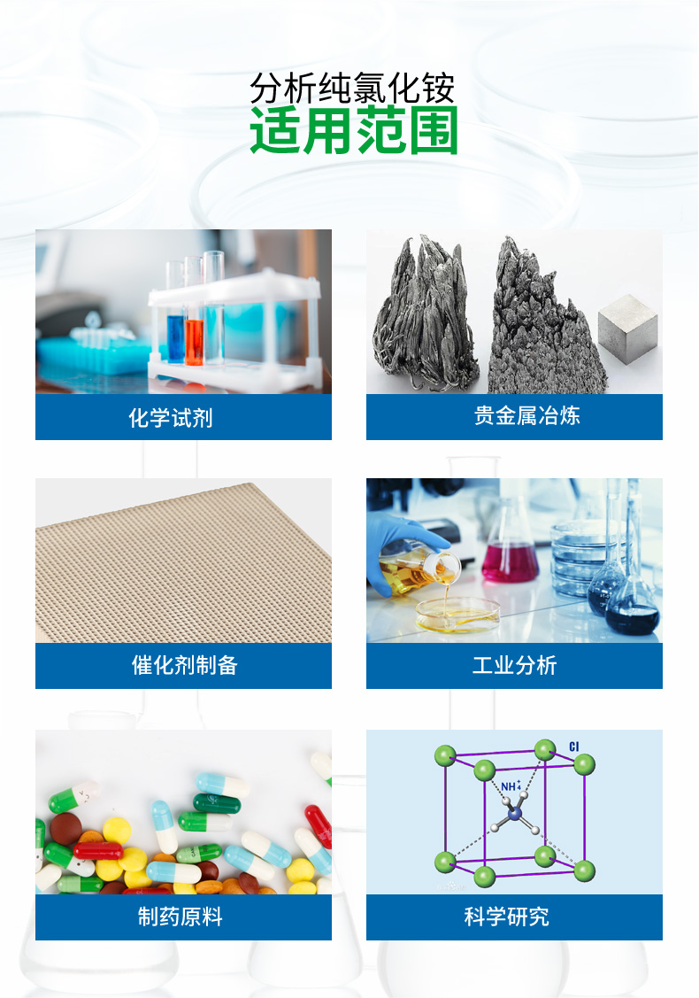 分析纯氯化铵是采用工业级氯化铵为原料,经过特殊工艺处理,使分析干扰杂质减至 。氯化铵主含量达到99.8%以上,澄清度符合三级标准,主要用于重要的工业分析和一般性科学研究工作。